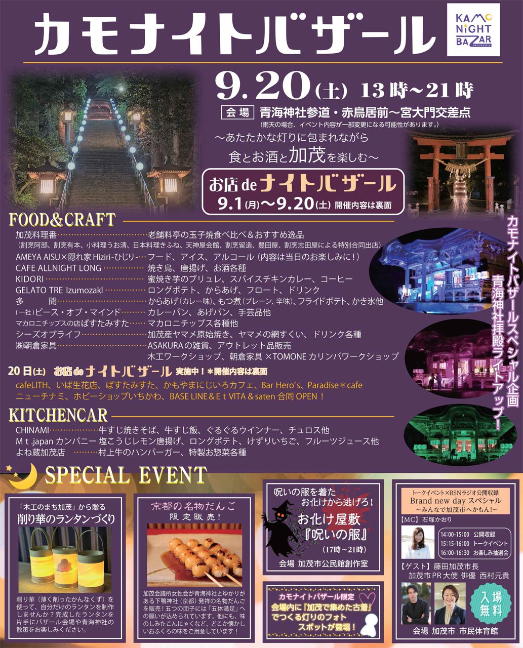 今回は「あたたかな灯りに包まれながら食とお酒と加茂を楽しむ」がテーマ。個性ある10店とキッチンカー3台が出店し、スペシャルな企画とともに夜のまちをを盛り上げる。
