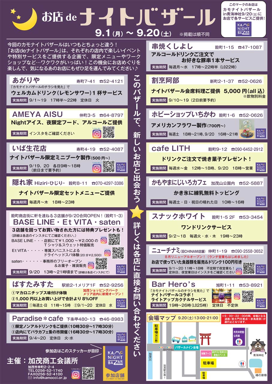 新潟県加茂市の商店街の有志がコロナ禍後の加茂市を盛り上げようと2023年秋に始まった「カモナイトバザール」。20日(土)午後1時から9時まで青海神社参道・赤鳥居前から宮大門交差点を会場に7カ月ぶりに開かれる。
