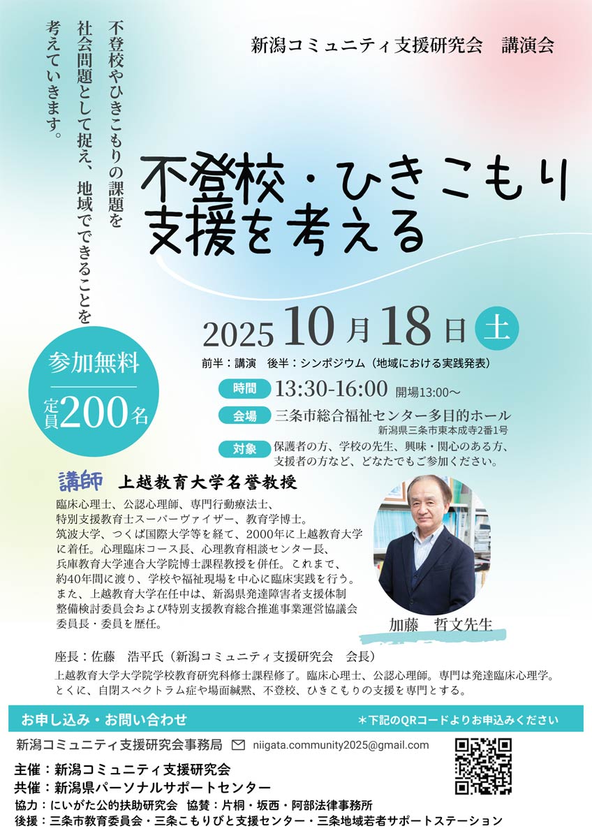 新潟県内で孤独・孤立化問題をはじめとする課題の解決策を検討、実行を目指す市民団体「新潟コミュニティ支援研究会」(佐藤浩平会長)は、10月18日(土)午後1時半から三条市総合福祉センター(三条市東本成寺2-1)で講演会「不登校・ひきこもり支援を考える」を開くので、広く参加を呼びかけている。