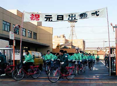列席者全員にヤクルトを配り、羽二生良夫郵便利用者の会会長の音頭で乾杯して、いざ配達へ。配達員は10kgほどもある年賀状が入った黒いバックを手に、駐車場にずらりと並んだそれぞれの配達用の真っ赤な自転車やバイクのところへ移動。大宮俊一集配課上席課長代理の「しゅっぱーつ!」を合図に、三条凧ばやしの太鼓と職員、来賓の拍手が響くなか、駐車場出入り口に掲げた「祝元旦出発式」とある横断幕をくぐってそれぞれの配達地域へと飛び出した。