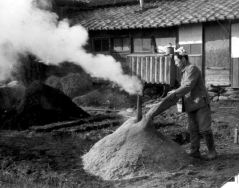 収穫したイネのもみ殻は、焼いて燻炭(くんたん)にしました。燻炭は農作物を丈夫に育てる肥料として田んぼや畑にまかれました。