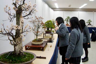 初日13日は次々と市民が訪れ、会員が丹精込めて育てる盆栽をじっくり鑑賞。自然界はまだ冬のただ中だが、会場にはさわやかなウメの花の香が広がる。ボケの淡いピンク色と白い花は、20日かけて盆栽展に開花を間に合わせた。黄緑のフキノトウはみずみずしく一足早い春も味わっていた。