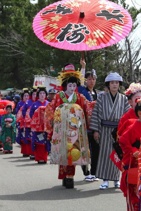 昨年は東日本大震災で中止になった第70回分水おいらん道中が15日、燕市の大河津分水桜並木や地蔵堂本町通りで行われた。サクラの開花は間に合わなかったが、抜けるような青空が広がり、一昨年と同じく8.5万人の人出でにぎわった。