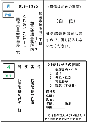 往信はがきの表面には郵送先、返信はがきの表面には申込者の郵便番号、代表者の住所、代表所の名前、裏面は白紙のままにする。郵送先は次の通り。