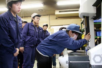 同社は1946年にプレス工場として創業し、農業機械部品の製造を主体に事業を拡大してきた。一貫生産に力を入れており、工場内にはプレス機械はもちろん、ボール盤、溶接ロボット、巨大なレーザー加工機が並び、まるで工作機械のデパートのよう。そのなかで黙々と作業を続けるプロの仕事の現場に、学校の作業服に作業帽の生徒は目を輝かせて見入っていた。