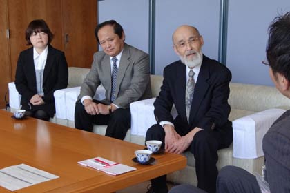午前10時前ころ、佐竹さんとボランティアグループ「結」の会の金子敏美会長と事務局の千葉和子さんの3人が市役所を訪れた。佐竹さんは「2年間の避難生活をつつがなく送るころができたことへの感謝の気持ちと早期復興の願いを込めている」として、国定市長にマツを植えるための費用など一式とする目録を手渡した。