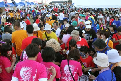 これまで1日だけで行ったが、ことし初めての試みとして、前日28日にもプレイベントを行った。メーン会場も道の駅裏手の酒呑童子神社から県道に面した駐車場の緑地に移したので、ドライバーの目にも止まった。