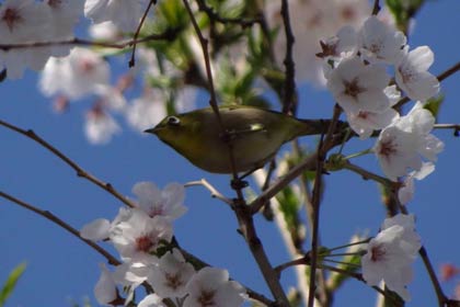 江口地内では、民家の屋根より高い大きなサクラが、風が吹くたびにちらちらと花びらを散らして花吹雪に。庭月の諸橋轍次記念館では、白っぽい花びらのヤマザクラは満開で、ピンク色のシダレザクラは五分咲きから八分咲き、諸橋博士の生家前の巨木は散り始めだが、たくさんの野鳥が集まっていた。