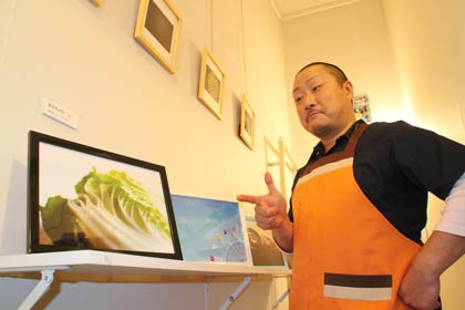 長岡市出身で東京で活躍する現代音楽家のひらさわりょうさんは掛け時計の文字盤にエロチックな作品をはめ込んだ。ショートムービーの監督も務める新潟市の会社員カンダアキラさんは枯れ葉や花を時間が止まったように切り取った。そして店主の関本秀次郎さん(41)はハクサイのアップや観覧車など何気ない風景を独特な完成で切り取る。