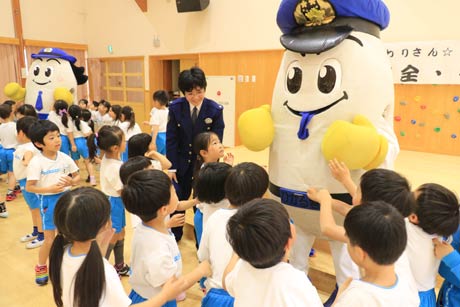 こども園と燕市交通安全協会、燕市高齢者交通指導員連絡協議会と協働して開いたもので、大会に参加したのは年長児70人と県知事の委嘱を受けている燕市内の燕市内の高齢者交通指導員約40人のうち16人。県警のマスコットキャラクター、ひかるくんとひかりちゃんも応援に駆けつけた。