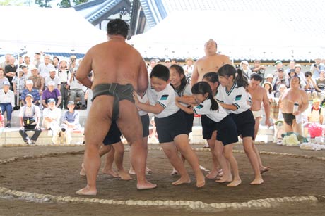 しこを踏むなどして練習をしめくくると、弥彦小学校3年生とのふれあい子どもけいこ。体操着を着た小学生が束になってかかっても力士はぴくりともしなかったが、最後は土俵を割って小学生に軍配。小学生を抱き上げて振り回したり、一人ひとり次々と抱き上げて土俵の外の力士に渡したりして笑いを誘った。最後は日馬富士も小学生の相手を買って出て会場をわかせた。