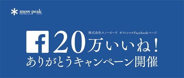 スノーピーク(山井太社長・本社三条市中野原)は、オフィシャルFacebookページが20万「いいね!」を突破し、感謝を込めて23日から6月22日まで「ありがとうキャンペーン」を行っている。