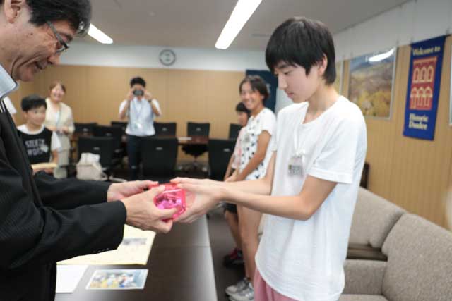 青空運営委員会を構成する5、6年生13人のうち会長の深沢空斗さんをはじめ6年生6人が市役所を訪れ、1人ずつ順番に日赤新潟県支部燕市地区の会長でもある鈴木力市長に寄付を手渡した。