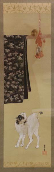 来年はねずみ年。松川藤陰の「和気対眼」は、物干しにのぼったネズミとのその真下にいるネコがにらみ合っているようなようすを描く。軸の縦長の画面を効果的に使って切り取り、どこかユーモラスでもある。
