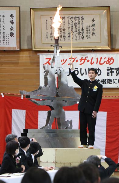 恒例で運動会でもともしている「希望の炎」に火を移した。この日の夜、2020東京五輪・パラリンピックと聖火リレーの中止が決まったが、こちらは無事に点火した。