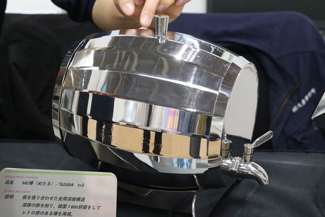 溶接の(株)大倉製作所(燕市大川津)の酒樽(さかだる)を模したME樽(めたる)は、2ミリの薄いステンレスを張り合わせた全周溶接構造。溶接あとがわからなくなるまで研磨で滑らかに仕上げている。