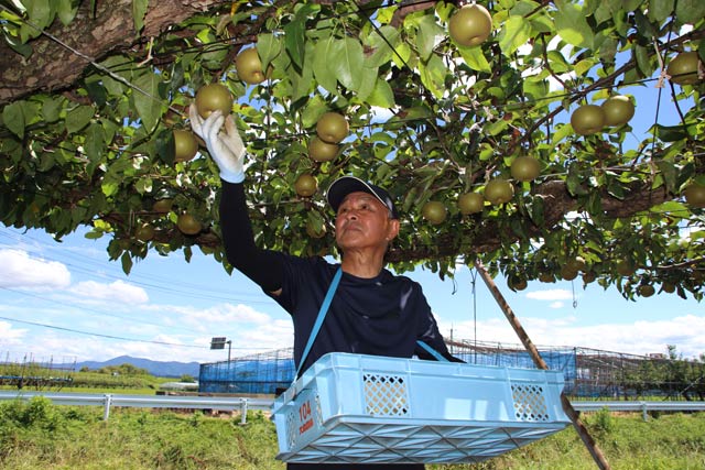 三条市井戸場のナシ畑では、天果糖逸出荷販売協議会日本なし部会長の渡辺和実さん(64)は、ナシを収穫していた。ナシは待ってくれず、実っただけ収穫しないわけにはいkない。