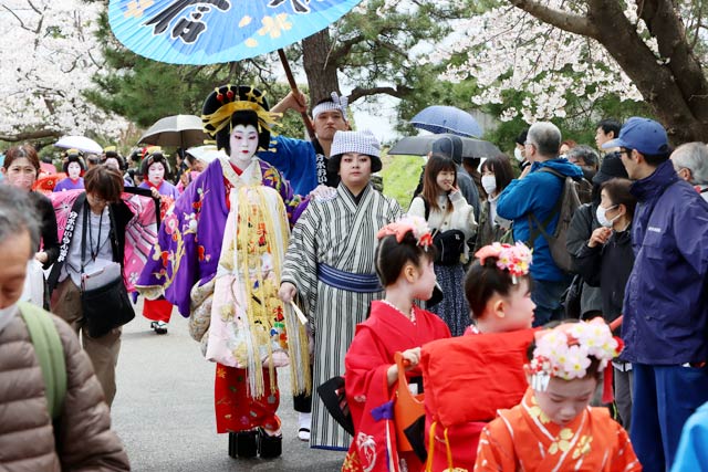 雨をおしても満開の桜とおいらんで春を感じる魅力が勝ったようで、来場者が多かった。とくにことしは2会場の順番を入れ替えて先に行った大河津分水桜並木の観衆が昨年より目に見えて多かった。