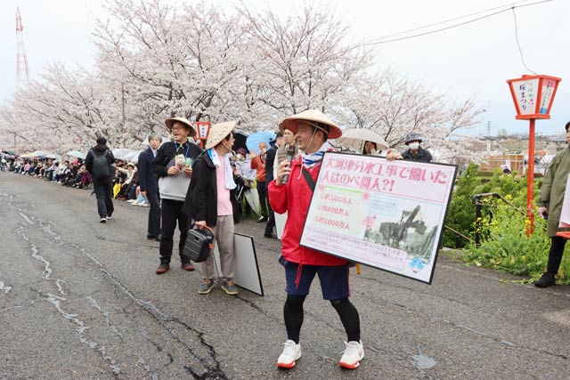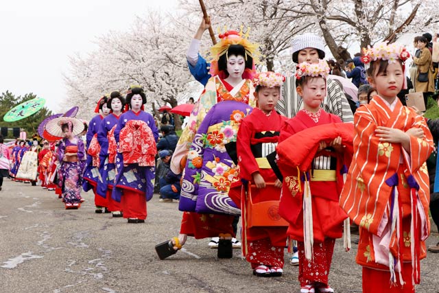 ことしは第80回の節目。公募で選ばれた信濃太夫、分水太夫、桜太夫の3人のおいらん役をはじめとした61人で行列を編成し、大河津分水桜並木と地蔵堂本町通りの2カ所で時代絵巻を披露した。