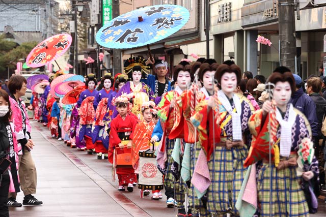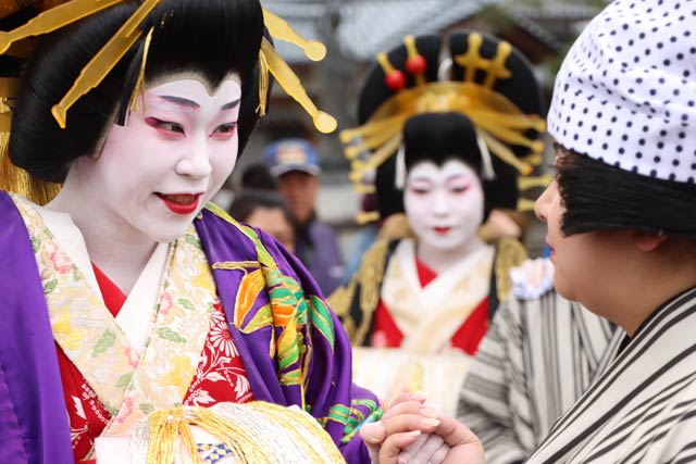 三味線のはやしをBGMに行列を進め、途中で何度か行列を止めて行う外八文字が見せ場。おいらん役が高さ15センチの三枚歯黒塗りの高げたをゆっくりと外へ振り出して前に運ぶと大きな拍手でわいた。