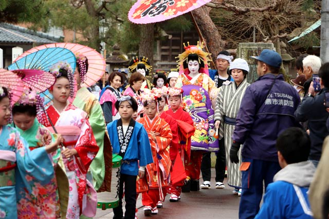 大河分水桜土手ではおいらん役の体調不良もあって出発が30分ほど遅れ、リタイアすることもあったが、地蔵堂本町通りでは3太夫がそろって大役を果たした。