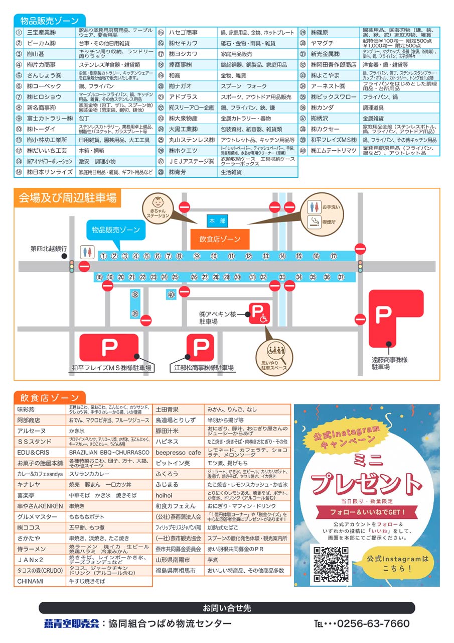 また、今回初めてインスタグラムの公式アカウント「燕青空即売会 (@aozora_sokubaikai)」を取得。「フォロー」してどれからの投稿を「いいね!」した画面を協同組合つばめ物流センターの本部で提示すると、数量限定でミニプレゼントがもらえる。