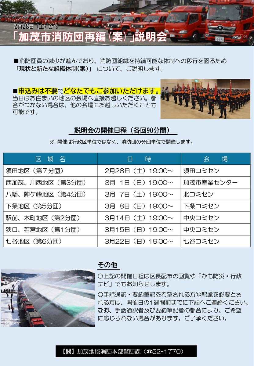説明会は2月28日から3月22日まで、市内7会場で分団単位に実施。申し込みは不要で、どの会場にも参加できる。地域防災の要である消防団の将来について、多くの市民に関心をもってほしいと期待する。