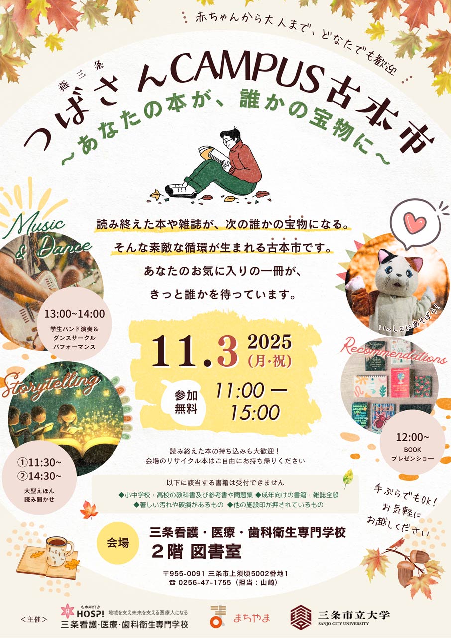 読み終えた本が新たな持ち主の宝物となる、地域に根ざした循環型イベント「つばさんCAMPUS古本市」が11月3日(月・祝)、三条看護・医療・歯科衛生専門学校(新潟県三条市上須頃)の2階図書室で開かれる。三条市図書館複合施設「まちやま」、三条市立大学図書館、そして三条看護・医療・歯科衛生専門学校図書室の3館が共催する初のイベントで、地域住民に読書の楽しみと交流の場を提供する。