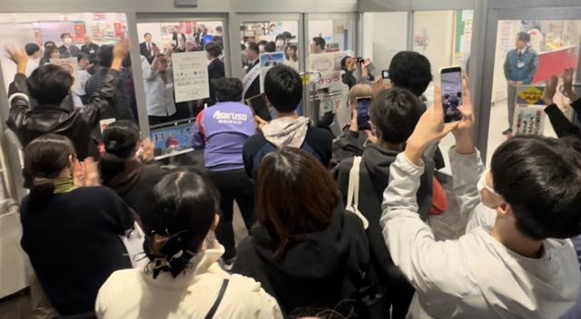 店内放送で「蛍の光」が流れるなか、従業員は通路両側に並んで客を見送った。最後のひとりを送り出すまで正面入り口前に数十人の客が残り、午後7時58分、再び「43年間ありがとうございました」でドアが閉まった。