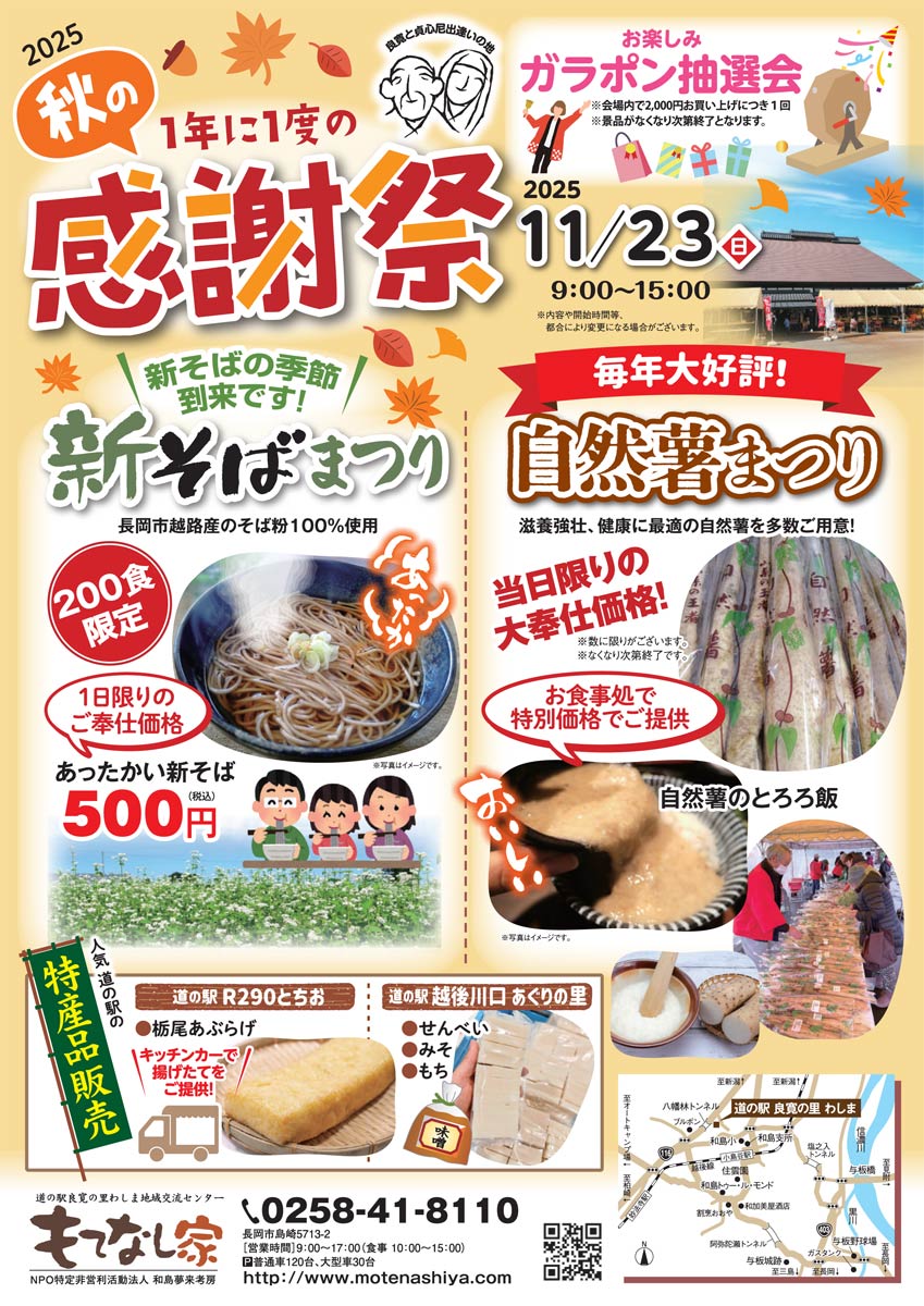 新潟県長岡市島崎の「道の駅 良寛の里 わしま」は11月23日(日)午前9時から午後4時まで、年に一度の秋イベント「感謝祭」を開く。新そばや自然薯(じねんじょ)をはじめ、旬の味覚を楽しめる多彩な企画がそろう。