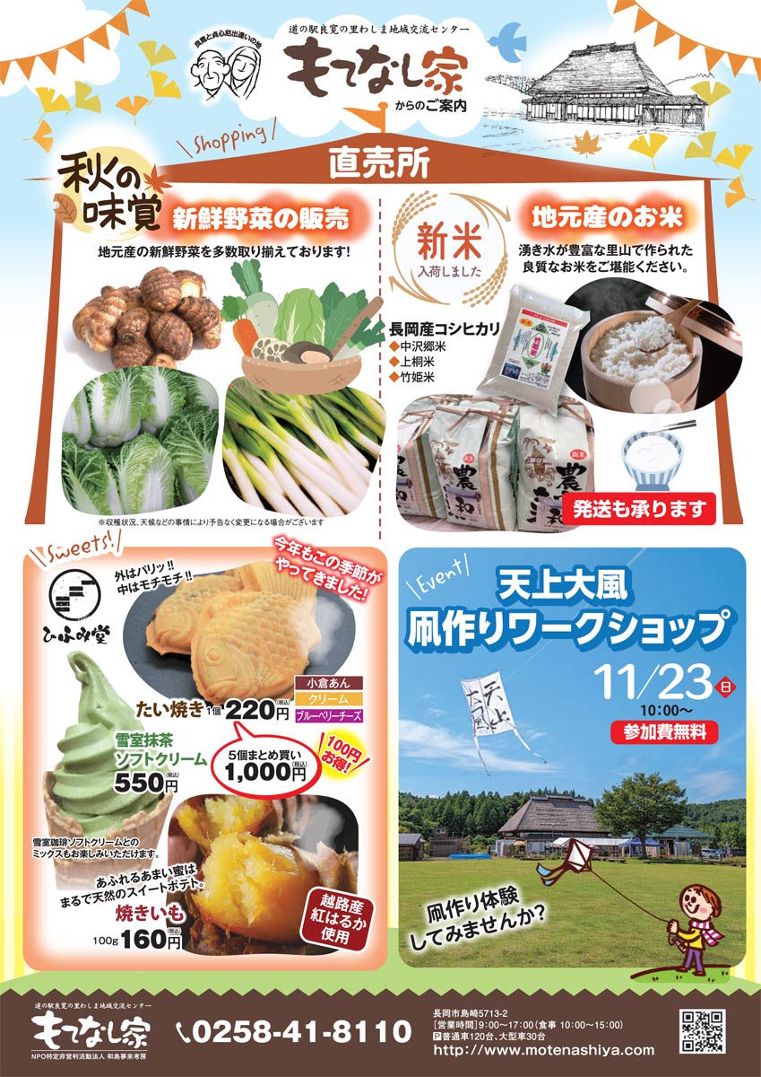 直売所では、秋の里山で採れた新鮮野菜や長岡産コシヒカリの新米を販売。中沢郷米、上組米、竹縄米など地元地域で収穫された米がそろい、発送にも対応する。