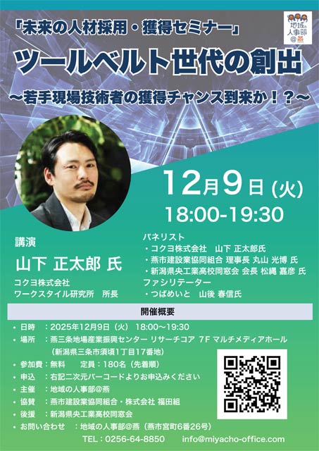 新潟県燕市の「地域の人事部@燕」は、12月9日(火)午後6時から7時半まで燕三条地場産業振興センター・リサーチコアでコクヨ株式会社の社内専門研究機関「ワークスタイル研究所」の山下正太郎所長を講師に未来の人材採用・獲得セミナー「ツールベルト世代の創出〜若手現場技術者の獲得チャンス到来か!?〜」を開く。