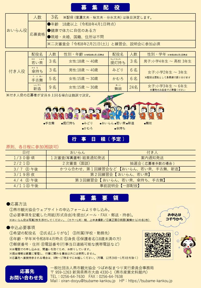 新潟県燕市の燕市観光協会では、2026年4月12日(日)に開催される「第81回分水おいらん道中」のおいらん役をはじめとする出演者を募集している。応募締め切りは26年1月18日(日)。