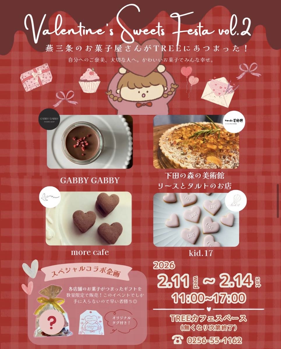 14日のバレンタインデーにあわせて新潟三条市・一ノ木戸商店街にある中心市街地拠点施設「TREE」 で11日(水)から14日(土)までバレンタインイベント「Valentine’s Sweets Festa Vol.2」が開かれる。昨年に続く開催で、ことしは燕三条地域の菓子店が一堂に会し、委託販売という形で多彩なスイーツを提供する。