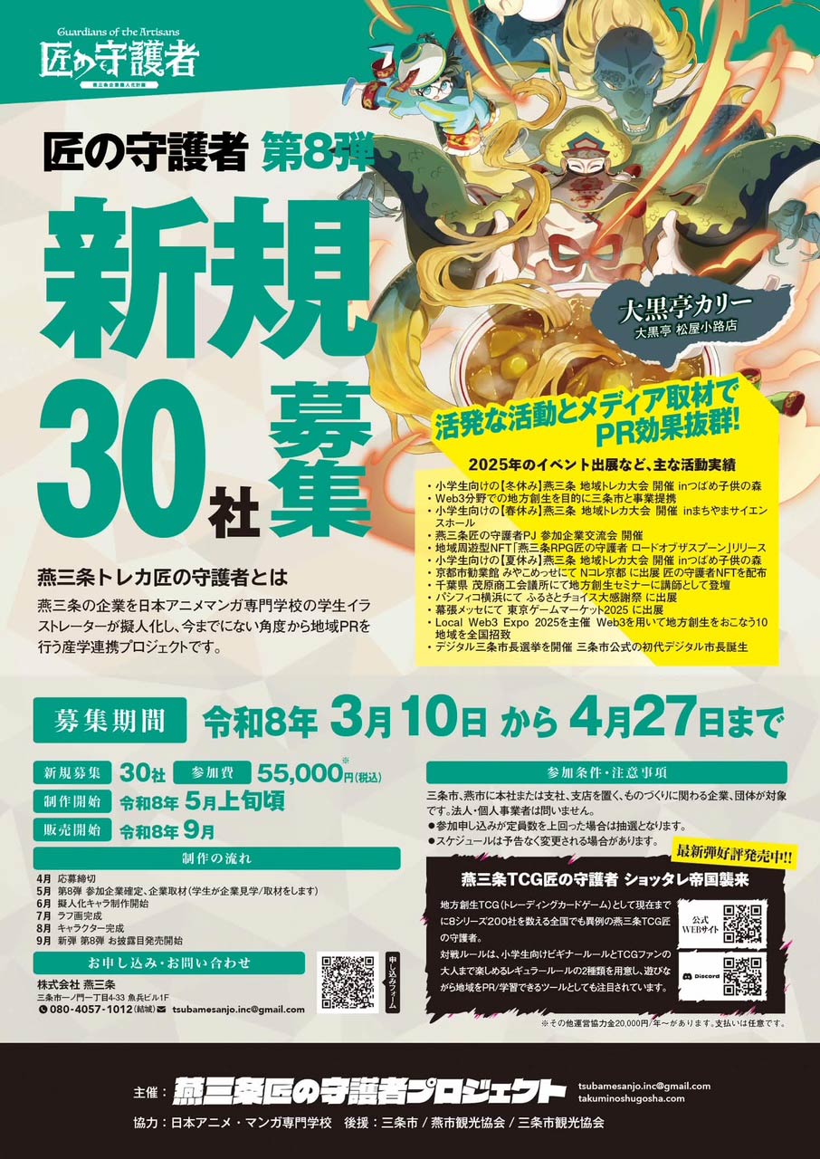 燕三条TCG匠の守護者は、日本アニメ・マンガ専門学校(JAM)の学生デザイナーが燕三条地域の企業を擬人化して制作するトレーディングカードゲームとして2019年にスタートした。