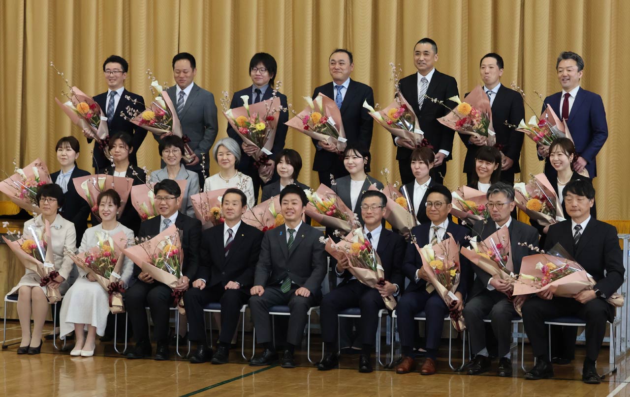 退職者は60歳で退職の8人、割愛の教職員3人のほか普通退職の合わせて33人。一人ひとり名前を呼んで滝沢市長が辞令を読み上げて手渡し、花束も贈った。退職者はそれぞれ席に戻る前に短くあいさつした。