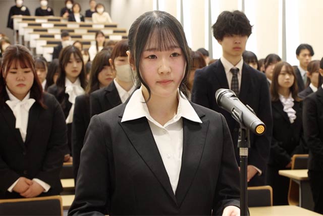 「学校を巣立つときには、学んだことすべてと仲間との思い出を胸に強い意志を持ち、夢に向かって活躍する立派な人間になりたい」、「これから始まる学生生活を通じて自覚をもち、仲間と励まし合い、夢の実現に向けて精一杯、努力し、ひとつひとつ成長していくことをここに誓う」と述べた。