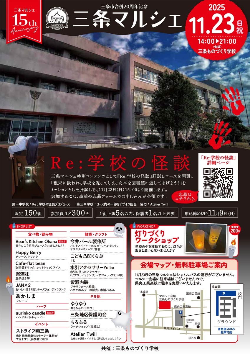 23日(日・祝)午後2時から9時まで新潟県三条市桜木町、三条ものづくり学校で三条マルシェ「Re:学校の怪談」が開かれる。
