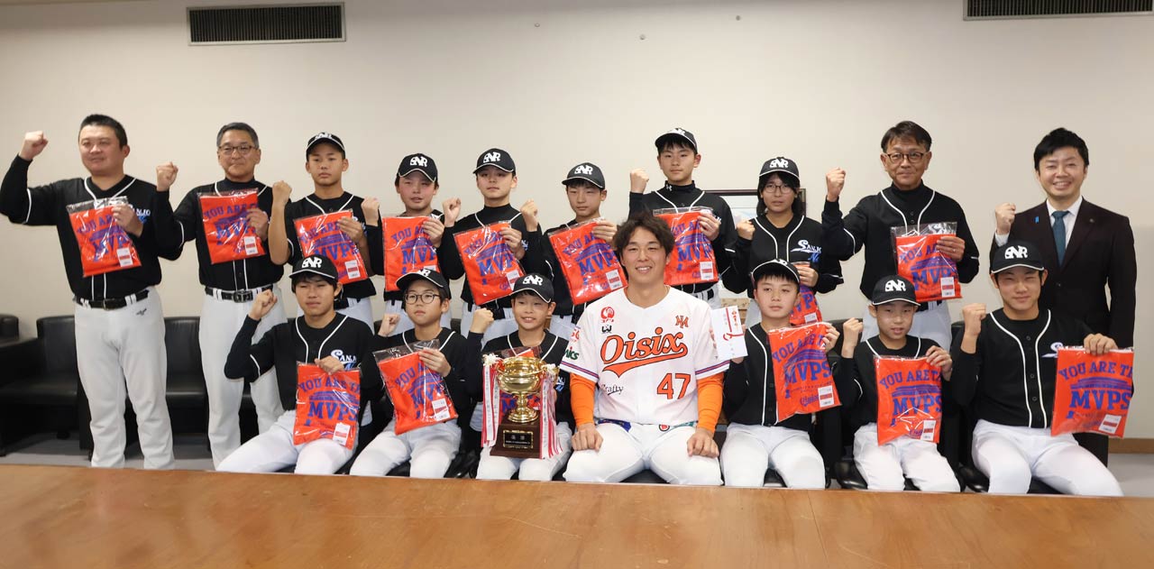笠原投手の激励に塚田晄人キャプテン(旭小)は「勇気が出ました。全国大会優勝を目指して頑張ります」と力強く応えた。質疑応答では、選手たちから「遠くにボールを飛ばすには?」「足を速くするには?」「肩を強くするには?」といった具体的な質問に笠原投手はていねいに答えた。