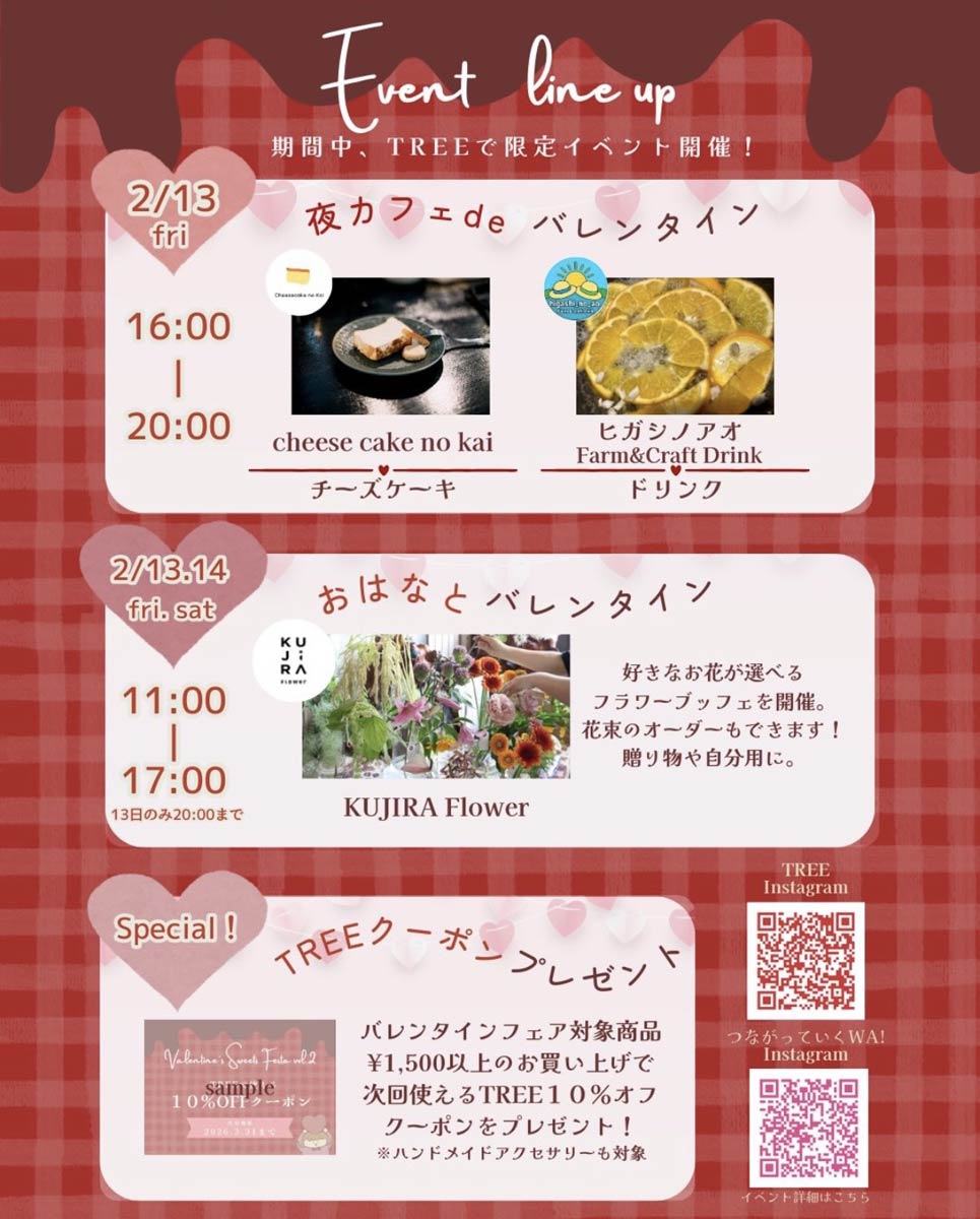 期間中は来場特典も用意。対象商品を税込1500円以上購入すると次回、使えるTREEの10%オフクーポンがプレゼントされるほか、気持ちを言葉にして添えられるメッセージカード企画も。いずれも数量限定のため、早めの来場を呼び掛けている。