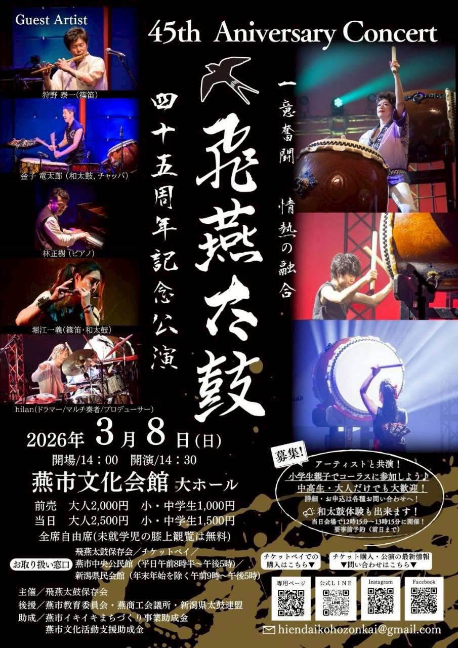 公演タイトルは「飛燕太鼓45周年記念公演」。開場は午後2時、開演は午後2時半。前売り券は大人2,000円、小・中学生1,000円、当日券は大人2,500円、小・中学生1,500円。全席自由で、未就学児の膝上観覧は無料。