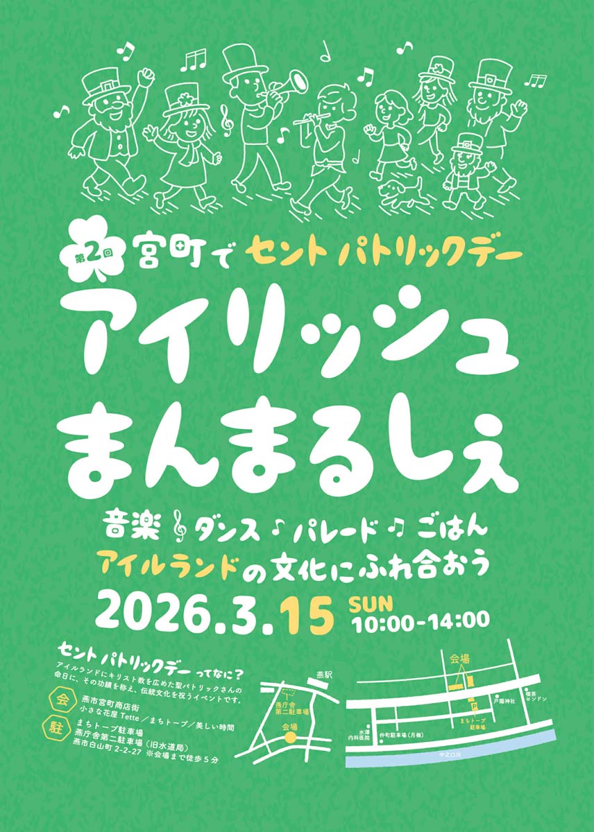アイルランドの祝祭「セント・パトリックデー」にちなみ、音楽やダンス、パレードなどを楽しむイベント「第2回 宮町でセントパトリックデー アイリッシュまんまるしぇ」が15日(日)午前10時から午後2時まで、新潟県燕市の宮町商店街周辺を舞台に開かれる。